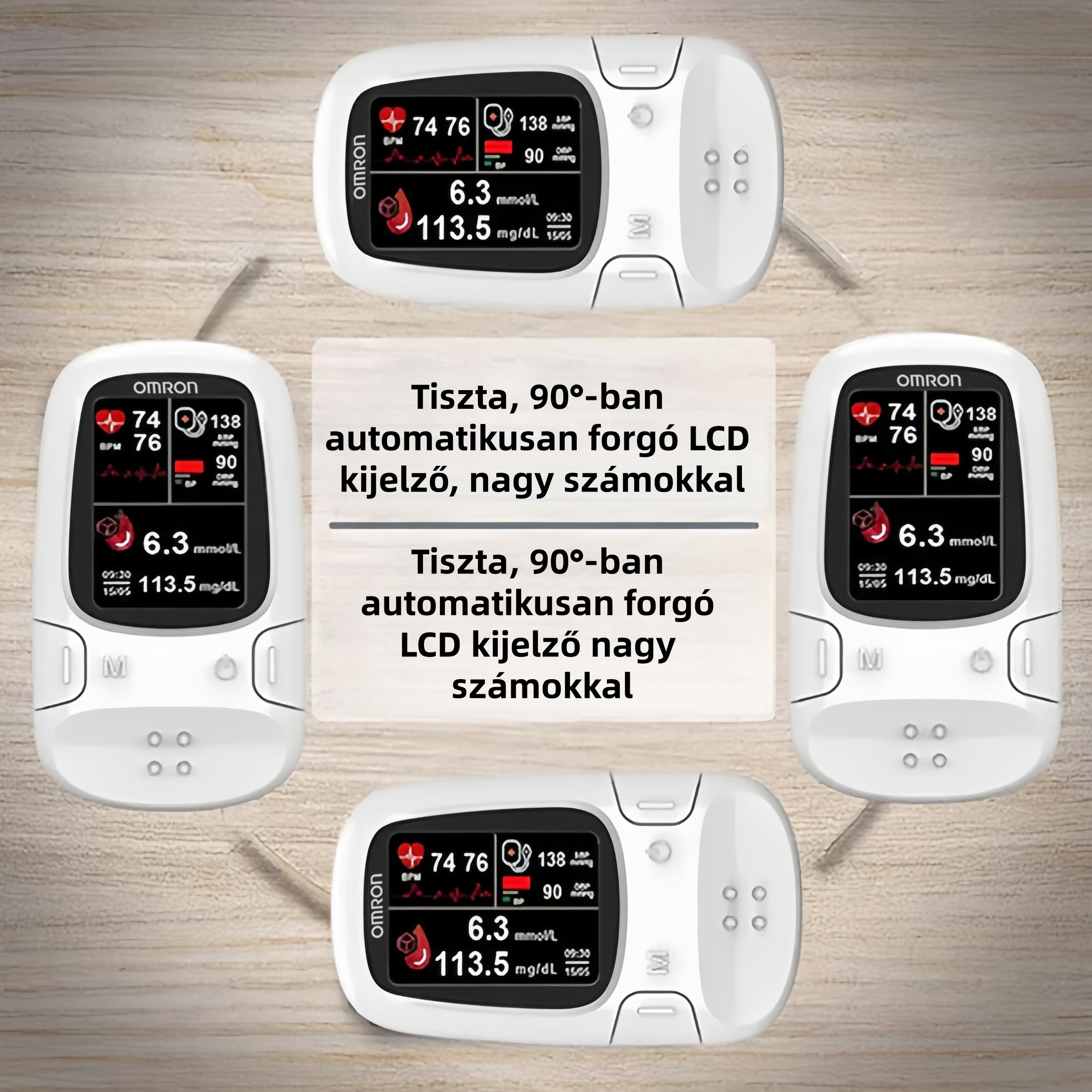 Bekapcsolás után az Omron™ készülék minden egyes bekapcsológomb-megnyomáskor automatikusan vált a kijelző módok között, így az értékek bármilyen szögből kényelmesen olvashatók.